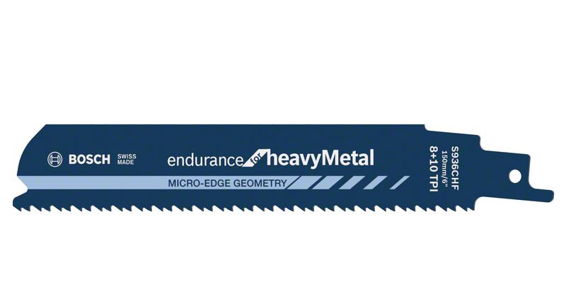 Das S 936 CHF Endurance for Heavy Metal Säbelsägeblatt bietet präzises und schnelles Schneiden in Metall. Der breite Körper (25 mm) kombiniert mit besonders dickem Material (1,1 mm) ermöglicht genaue, gerade Schnitte. Zudem sorgt die patentierte, feine 2x2-Zahnteilung des Blatts für mühe- und reibungsloses Arbeiten, wodurch die Geschwindigkeit und Haltbarkeit bei dicken Materialien erhöht wird. Durch die Micro Edge-Zahngeometrie mit präzisionsgeschliffenen Zähnen wird die maximale Lebensdauer sichergestellt. Das Blatt aus Bi-Metall ist für das Schneiden von Stahl mit normaler Stärke vorgesehen. Die große Zahnteilung (2,5 + 3,2 mm) des Blatts kann für Rohre und Profile mit großer Wanddicke von 4–12 mm verwendet werden. Die Standardlänge von 150 mm bietet eine Schnittleistung von bis zu 100 mm.