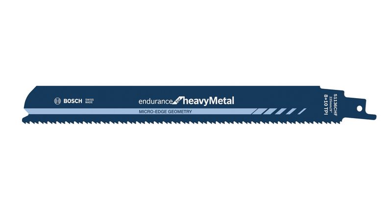 Das S 1136 CHF Endurance for Heavy Metal Säbelsägeblatt bietet präzises, schnelles und gerades Schneiden in Metall. Der breite Körper (25 mm) und die dicke Wandstärke (1,1 mm) ermöglichen genaues Schneiden. Zudem sorgt die patentierte, feine 2x2-Zahnteilung des Blatts für mühe- und reibungsloses Arbeiten. Durch die Micro Edge-Zahngeometrie mit präzisionsgeschliffenen Zähnen wird maximale Belastbarkeit sichergestellt. Das Blatt aus Bimetall ist für das Schneiden von Stahl mit normaler Stärke vorgesehen. Die große Zahnteilung (2,5 + 3,2 mm) des Blatts kann für Rohre und Profile mit großer Wanddicke von 4–12 mm verwendet werden. Es verfügt über eine Standardlänge von 225 mm, die eine Schnittleistung von bis zu 175 mm ermöglicht.