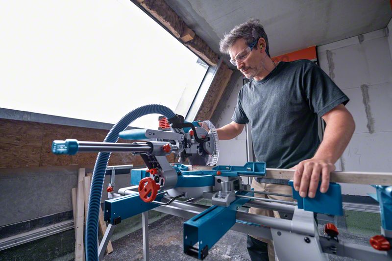 Akku-Kapp- und Gehrungssäge BITURBO GCM 18V-216 D. Die kabellose GCM 18V-216 D Professional bietet maximale Schnittleistung dank ihres BITURBO Brushless-Antriebs kombiniert mit einem ProCORE18V-Akku. Die mobile Kapp- und Gehrungssäge ermöglicht durch ihre abnehmbaren Werkstückauflagen und langen Tischverlängerungen eine gute Kontrolle beim Schneiden langer Materialstücke. Ihre beidseitige Neigungseinstellung mit ergonomischem Drehschalter für die Neigungsverriegelung sorgt für mehr Komfort und Flexibilität bei anspruchsvollen Schnitten. Die GCM 18V-216 D Professional ist vielseitig einsetzbar für Querschnitte, Gehrungsschnitte und Neigungsschnitte in Holz, Aluminium und PVC-Kunststoff. Er ist mit allen Akkus und Ladegeräten aus dem Bosch Professional 18V System kompatibel. Für maximale Leistung: ProCORE18V ≥ 5,5 Ah. Für eine ausreichende Laufzeit werden 8 Ah oder 12 Ah empfohlen. Sie ist auch kompatibel mit allen Bosch Saugern, GTA-Arbeitstischen und Sägeblättern für Akku-Kapp- und Gehrungssägen. Die leichte Akku-Kapp- und Gehrungssäge bietet verschiedene einhändige oder beidhändige Trageoptionen und ist dank ihrer kompakten Bauweise leicht zu transportieren. Durch den Doppellinienlaser mit Laserlinien links und rechts des Sägeblatts ermöglicht sie präzisere Schnitte. 1 x Kreissägeblatt, Standard for Wood, 216 x 30 x 1,7 mm, 24 (2 608 837 721); 2 x Werkstückauflage (flexibel einsteckbar) (1 609 B07 675); Staubbeutel (2 608 000 841); Klemme (1 609 B06 930)
