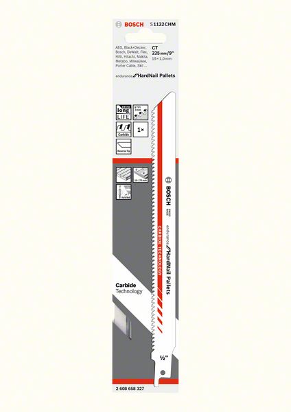 Das S 1122 CHM Endurance for HardNail Pallets ist das einzige Blatt von Bosch auf dem Markt, das harte Palettennägel effektiv schneidet. Seine moderne Carbide-Technologie sorgt für eine extralange Blattlebensdauer. Dies ermöglicht effektive Schnitte durch gehärtete Palettenreparaturnägel und hochfeste Stahlbefestigungen, die in der Palettenreparaturbranche immer gängiger werden. Mit einer konstanten Zahnteilung von 8 TPI/3 mm widersteht dieses Blatt sogar härtesten Einsätzen. Ultimative Flexibilität – durch die individuell geschweißten Zähne kann sich das Blatt beim Schneiden biegen – eine wesentliche Voraussetzung für die Palettenreparatur.