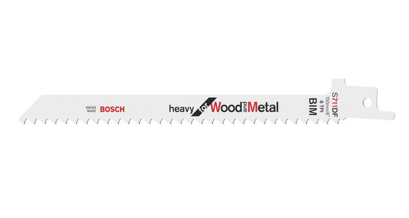 Das S 711 DF Heavy for Wood and Metal Säbelsägeblatt eignet sich für schnelle Kurvenschnitte in Holz und Metall. Große Zahnteilung (4,3 mm) und geschränkte Zähne für schnelle Ergebnisse. Die mittlere Wandstärke (1,25 mm) des Säbelsägeblatts bietet die beste Balance zwischen Geschwindigkeit, Flexibilität und Stabilität beim Schneiden. Zudem ermöglicht der vertiefte Körper perfekte Kurvenschnitte. Das Bimetallblatt ist für das Schneiden von weichen Nägeln, Baustahl und NE-Metallkomponenten in Holz optimiert. Es verfügt über eine Standardlänge von 150 mm mit einer Schnittleistung von bis zu 100 mm.