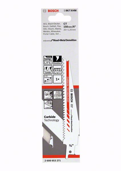 Das S 967 XHM Endurance for Wood and Metal Demolition Säbelsägeblatt wird selbst mit den härtesten Anwendungen fertig, insbesondere mit hochfestem Stahl in Holz. Es besitzt eine besonders lange Lebensdauer dank Carbide Technology, die ein besonders effektives Schneiden selbst in härteste Materialien sicherstellt. Die neuen breiteren Stege des Sägeblatts sorgen für einen ultimativen Halt der Carbide-Zähne, wodurch sie extremen Einsatzbedingungen widerstehen. Darüber hinaus ist das Zahndesign mit großen 5-7 Zähnen pro-Zoll (TPI) optimal für den Abriss von Holz mit Metall geeignet.
