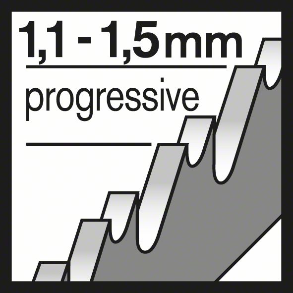 Das T 118 AF Flexible for Metal Stichsägeblatt ist bruchfest beim geraden Schneiden in Metall. Die gefrästen, gewellten Zähne sind zum Schneiden von Metallblech konzipiert. Die Zahnleiste aus gehärtetem HSS (Hochgeschwindigkeitsstahl) und BIM (Bimetall) ist mit hochelastischem HCS (Kohlenstoffstahl) verstärkt, wodurch das Bruchrisiko reduziert wird, und sowohl genügend Festigkeit als auch Flexibilität geboten werden, die beide erforderlich sind, um perforiertes Metallblech aus Stahl (Standard-Stärke) zu schneiden. Das Blatt ist mit einer sehr feinen progressiven Zahnteilung (1,1-1,5 mm) ausgestattet und schneidet eine Vielzahl an dünnen Metallblechen mit einer Dicke von 1-3 mm.