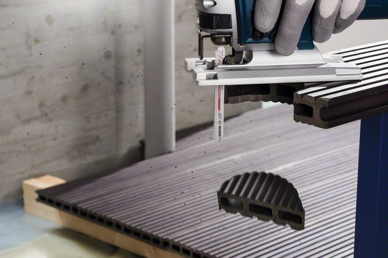 Das T 301 CHM Clean for Plastic Composites Stichsägeblatt ist besonders robust bei sauberen geraden Schnitten in Kunststoff. Die geschliffene Zahnleiste ist für die längere Nutzung mit abrasiven Kunststoffverbunden konzipiert, während die Zahngeometrie speziell dafür da ist, sauber zu schneiden. Die Zahnleiste ist zudem mit der Carbide Technology an einen hochelastischen Kohlenstoffstahlkörper geschweißt, wodurch das Blatt durch sehr robuste Oberflächen, wie z. B. Corian, Varicor und WPC (Holz-Kunststoff-Verbunde), schneiden kann. Es ist mit einer mittleren Zahnteilung (3,3 mm) mit einer größeren Länge (117) ausgestattet, die Platten aus abrasiven Kunststoffverbunden, Profile und massive Stäbe mit einer Dicke bis zu 65 mm schneidet.