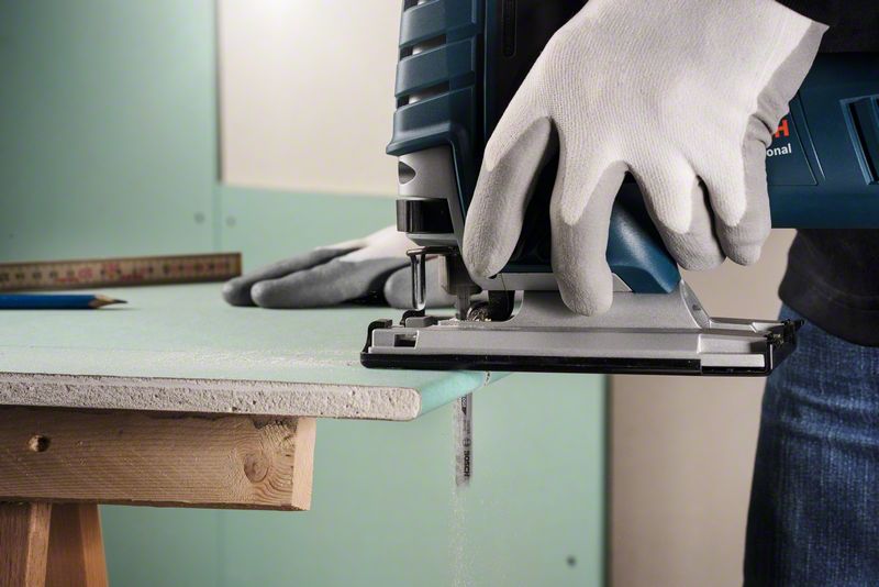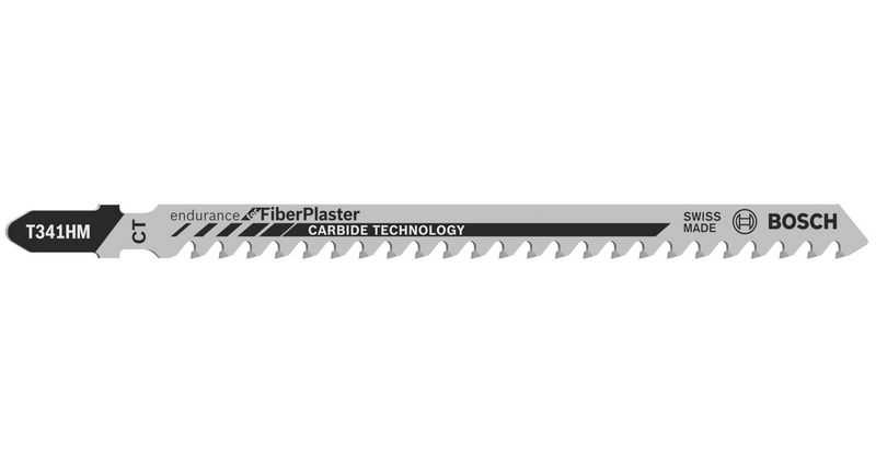 Das T 341 HM Special for Fibre and Plaster Stichsägeblatt ist besonders robust bei geraden Schnitten in Sonderwerkstoffen. Die geschliffenen, geschränkten Carbide-Zähne sind für eine lange Lebensdauer beim Schneiden von hochabrasiven Materialien auf Mineralbasis konzipiert. Die Zahnleiste ist zudem mit der Carbide Technology an einen hochelastischen Kohlenstoffstahlkörper geschweißt, wodurch das Blatt durch Zementfaserplatten, Gipskartonplatten, Porenbeton und glasfaserverstärkten Kunststoff schneiden kann. Es besitzt eine große Zahnteilung (4,3 mm) und eine große Länge (132 mm), um Faser- und Gipsmaterialien mit einem Stärke von bis zu 80 mm zu schneiden.